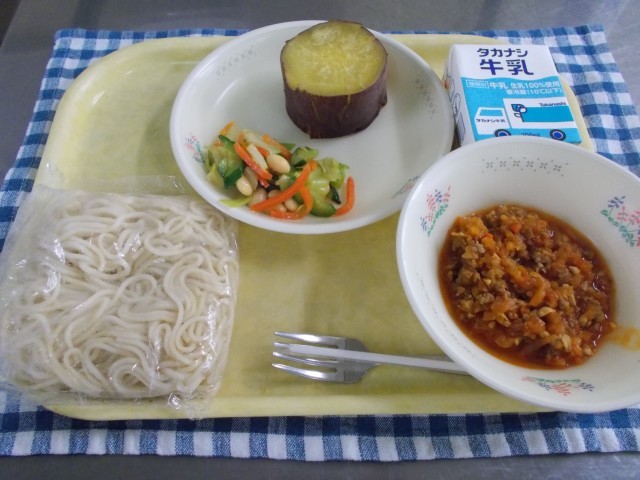 牛乳/ソフトめん/ミートソース/ビーンズサラダ/ふかしいも