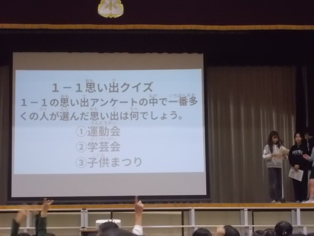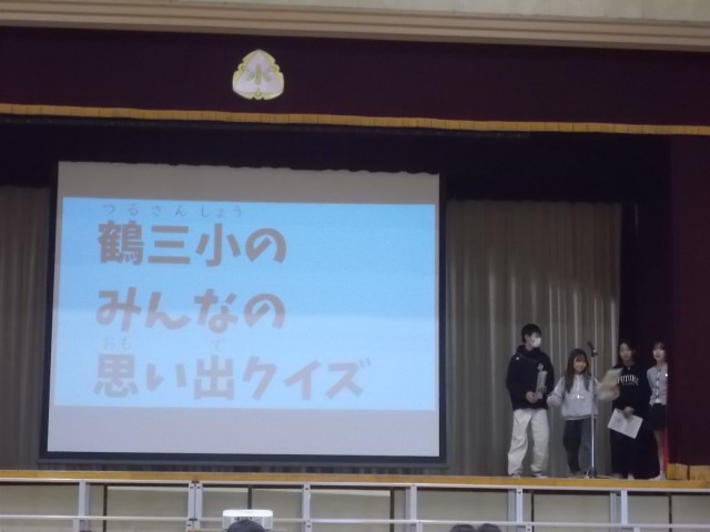 30日5時間目の閉校集会、歌えバンバンの次は「鶴三小のみんなの思い出クイズ」。各学級から1問ずつ、3択クイズが出題されました。学級エピソードや先生のこと、思い出について、全校みんなでクイズに取り組みました。正解が出るたびに歓声が沸き上がりました。
