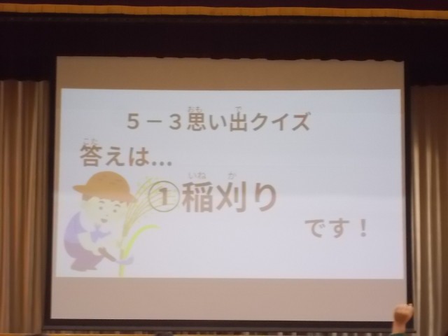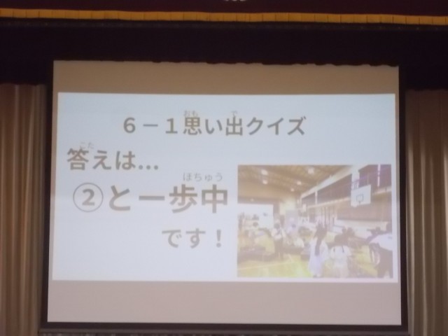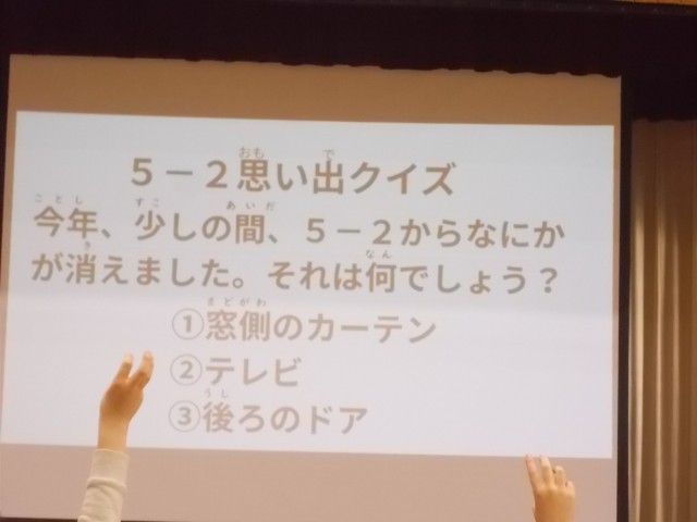30日5時間目の閉校集会、歌えバンバンの次は「鶴三小のみんなの思い出クイズ」。各学級から1問ずつ、3択クイズが出題されました。学級エピソードや先生のこと、思い出について、全校みんなでクイズに取り組みました。正解が出るたびに歓声が沸き上がりました。