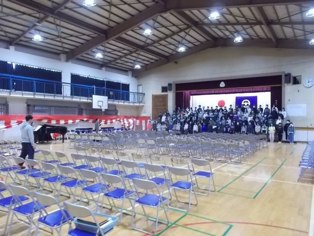 3日午前、体育館にて5・6年生が閉校式典の練習を行いました。この日は呼びかけと歌を中心に、頑張っていました。