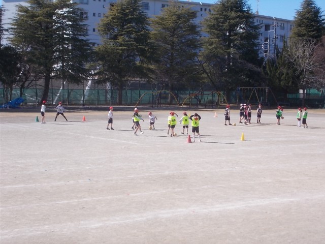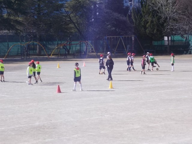 3日午前中、校庭で4年1組が体育の学習に取り組みました。この日はサッカーにチャレンジ。チームごとに色ビブスを身にまとい、グループ練習の後にミニゲームにもチャレンジ。3つのゲームコートを先生が見守り、声かけ励ましを行っていました。