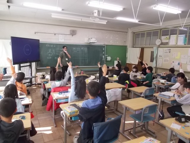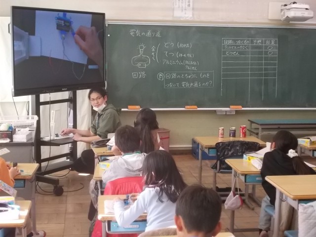 2日午後、3年2組教室にて理科の学習が行われました。この日は「電気をとおすもの」の単元の学びが進められました。豆電球は電気の回路ができていれば光ることを確認した後、実験キットを使い、自分の身の回りの様々なものが電気を通すか、確かめることができました。
