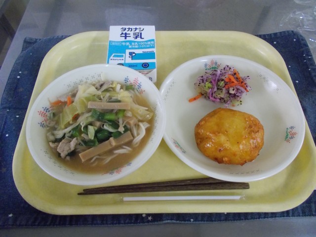 牛乳/町田市産メンマ入りみそラーメン/野菜のゆかり和え/チーズいももち