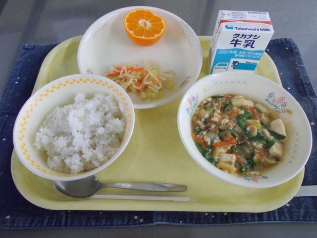 牛乳/麦ごはん/麻婆豆腐/中華和え/ぽんかん