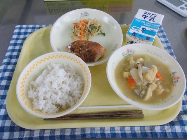 牛乳/麦ごはん/赤魚の香味焼き/もやしサラダ/豚汁