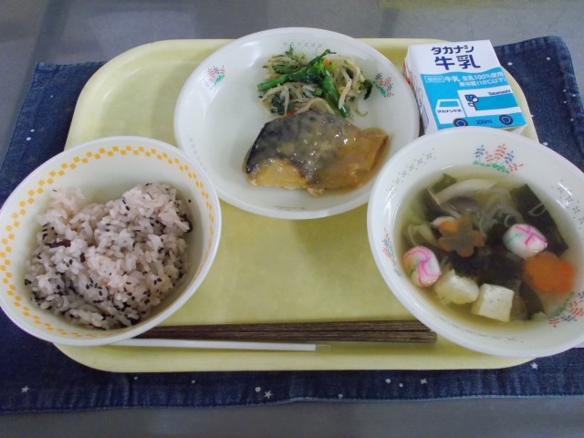 牛乳/赤飯/さばのみそだれかけ/菜の花のおかか和え/卒業お祝いすまし汁