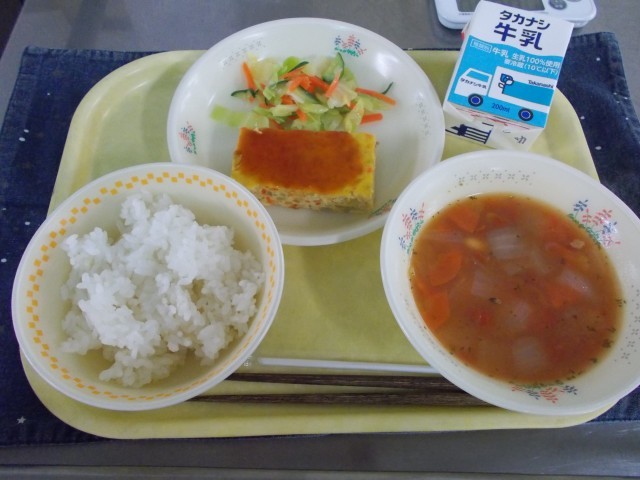 牛乳/ごはん/ポテトオムレツ/フレンチサラダ/まめまめスープ