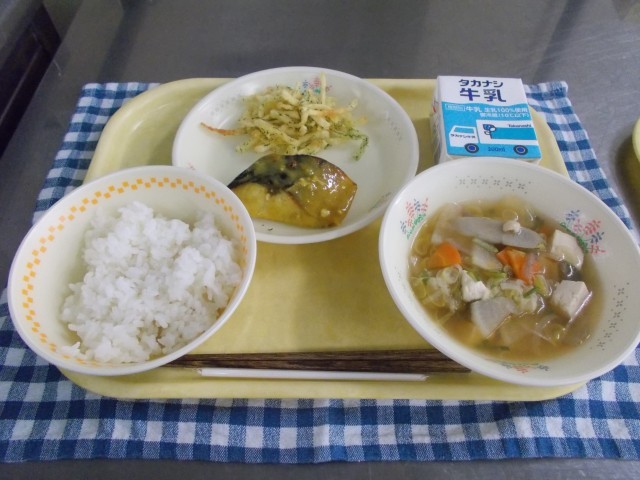 牛乳/ごはん/さばのカレーマヨ焼き/あおのりポテト/のっぺい汁