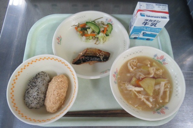 二色おはぎ 牛乳 さばの照焼き 即席漬け さつまいもの味噌汁