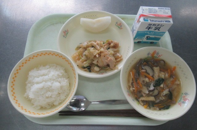 ごはん 牛乳 鶏ちゃん 沢煮椀 くだもの(梨)