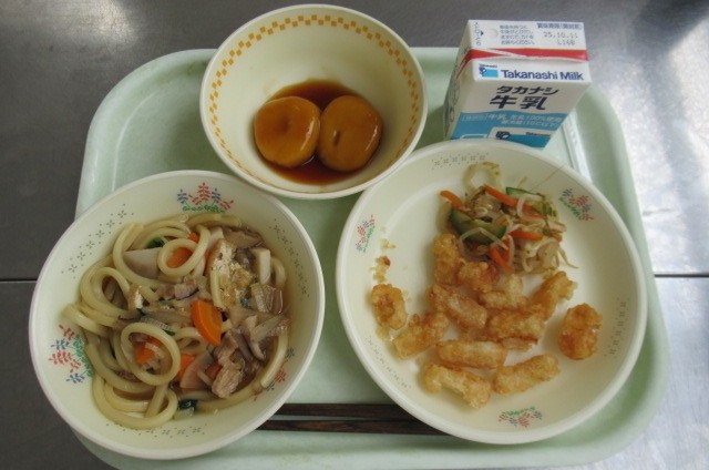 けんちんうどん 牛乳 いかのかりん揚げ 野菜の磯香あえ お月見だんご