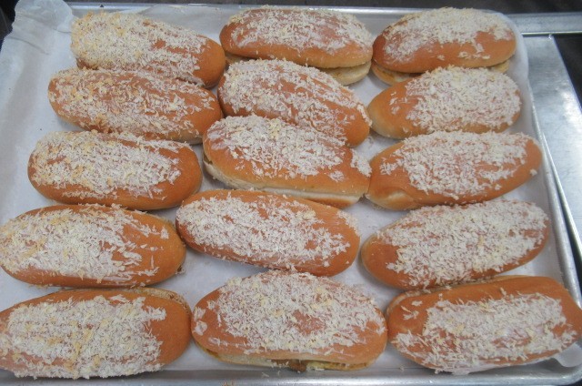 焼きカレーパンは、まず、ひき肉、刻んだ野菜、じゃがいもを炒め、カレー粉などで味付けしたドライカレーを作ります。この具をパンにはさみ、表面にパン粉をつけてオーブンで焼きました。油で揚げていないので、ヘルシーです。サクサクとした食感を味わって食べてください。
