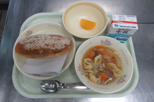 焼きカレーパン 牛乳 マカロニスープ くだもの(柿)