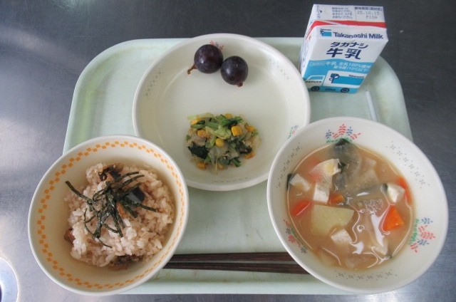 さんまごはん 牛乳 三色あえもの 呉汁 くだもの(ピオーネ)※巨峰から変更になりました。