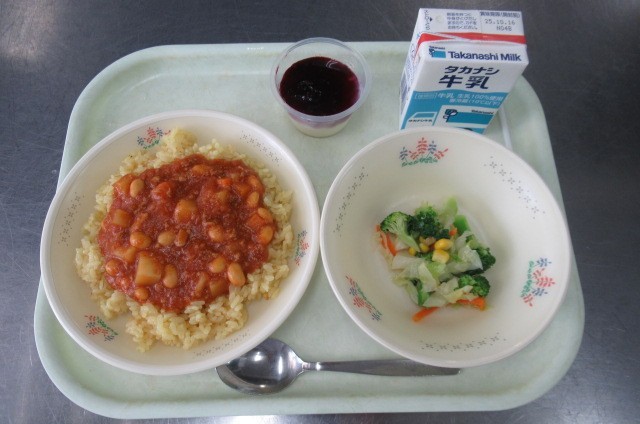 チリビーンズライス 牛乳 ブロッコリーサラダ パンナコッタ〜ブルーベリーソース〜