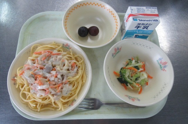 スパゲッティホワイトソース 牛乳 ハニーマスタードサラダ くだもの(巨峰)