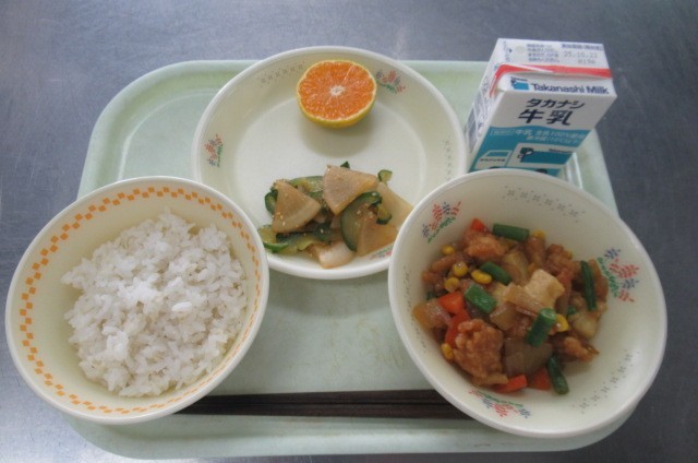 ごはん 牛乳 鶏肉とコーンの揚げ煮 かぶときゅうりの華風あえ くだもの(みかん)