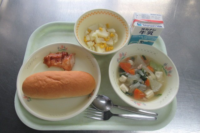 ショートニングパン 牛乳 照焼きチキン コーンポテト 豆腐と青梗菜のスープ