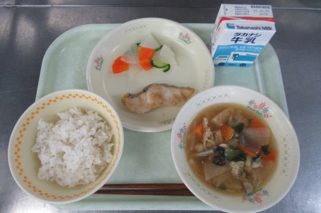ごはん 牛乳 ホキのごま焼き 野菜のゆず風味漬け きのこ汁