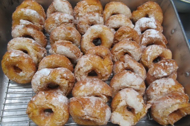 かぼちゃ、豆腐、小麦粉、ベーキングパウダー、砂糖、バター、牛乳で作った生地を輪っかにして油で揚げた後、粉糖をまぶしました。手作りのドーナツを味わっていただきましょう。