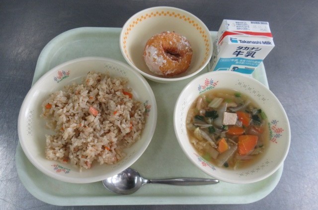 鮭ピラフ 牛乳 白菜スープ かぼちゃドーナツ