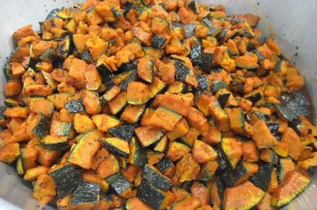 「かぼちゃの揚げ煮」は、かぼちゃを素揚げした後、水あめ、砂糖、しょうゆ、水、黒ごまで作ったタレをからめました。