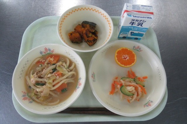 白ごまたんたんうどん 牛乳 かぼちゃの揚げ煮 大根サラダ くだもの(みかん)