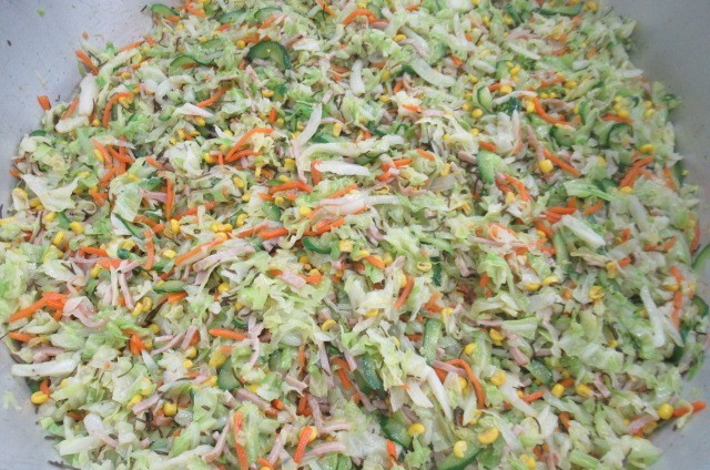 「りっちゃんの元気サラダ」は、国語の教科書にのっている「サラダでげんき」に登場するサラダを再現したものです。病気のお母さんを元気づけるために、りっちゃんが様々な動物たちに教わりながらサラダを作るお話です。今日は、ハム、野菜、昆布、かつおぶしを入れたサラダにしました。