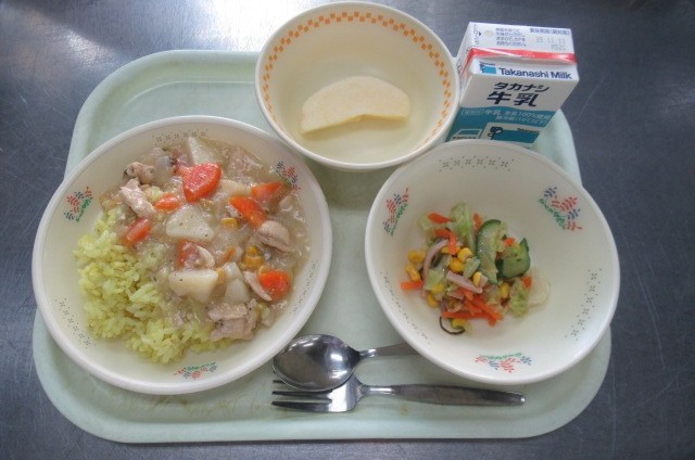 ターメリックライスクリームコーンがけ 牛乳 りっちゃんの元気サラダ くだもの(りんご)