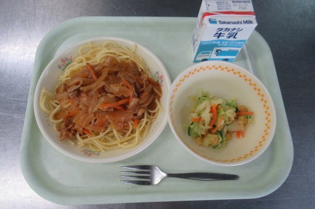 スパゲッティハッシュドポーク 牛乳 ビーンズフライサラダ