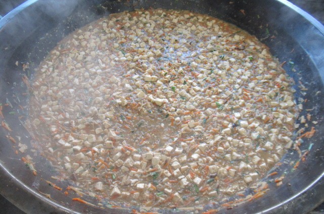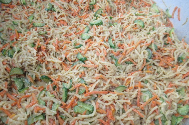 「バンバンジー」は、中国料理のひとつです。今日は、ゆでた野菜に、ごま油、しょうが、ねぎ、砂糖、しょうゆ、酢、塩、ねりごま、ラー油、白ごまで作ったドレッシングとあえました。サラダの大根は、まち☆ベジです。子供たちは、サラダをしっかり食べていました。