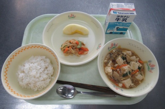 ごはん 牛乳 野菜麻婆豆腐 バンバンジー風サラダ くだもの(りんご)