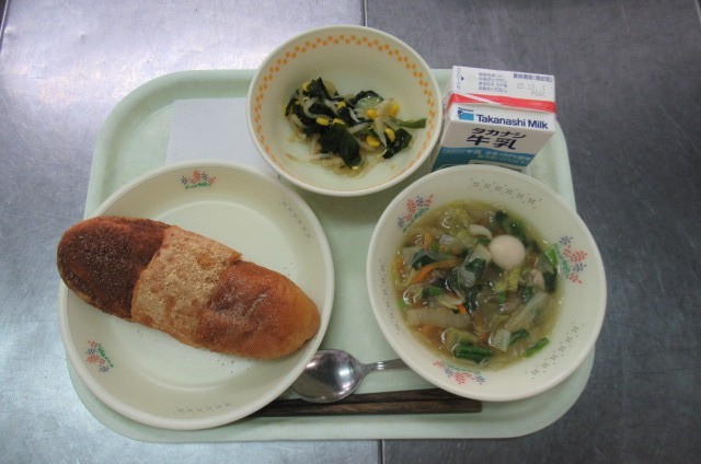 きな粉・ココア・シナモン揚げパン 牛乳 春雨スープ わかめサラダ