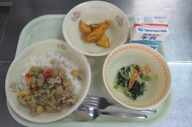 牛乳 コロコロ根菜ガッパオライス こまツナレモンサラダ じゃが揚げカレー風味