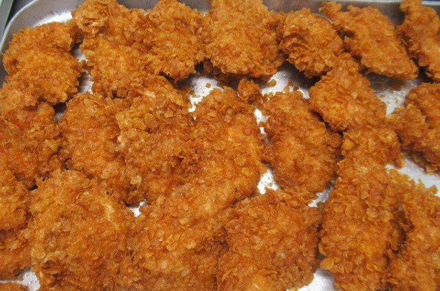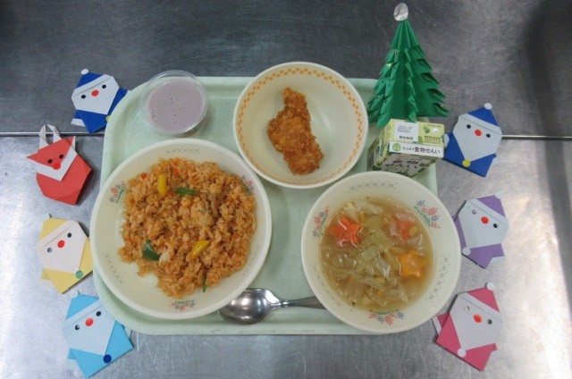 冬休み前最後の給食は、クリスマス献立です。ピラフは、クリスマスカラーの赤、緑、黄色を取り入れました。クリスピーチキンは、新しく取り入れた献立で、コーンフレークを衣にして油で揚げたものです。サクサクとした食感が大人気でした!!スープには、星型のにんじんを入れたり、リボンパスタを入れて、見た目が楽しめるように工夫しました。いちご豆乳ゼリーは、ゼリーカップにサンタクロースのシールを貼り、食べてみたくなるような工夫をしました。子供たちは、笑顔で「すごく美味しい!!「にんじんかわいい!!」と言いながら食べていました!!