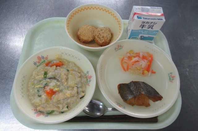冬休み明けの給食は、春の七草を使った「雑炊」、おせち料理に入っている縁起物の「紅白なます」です。また、鏡開きにちなんで、おもちの代わりに白玉だんごを作り、きな粉をまぶしました。今年もしっかり食べて、元気に過ごしましょう。