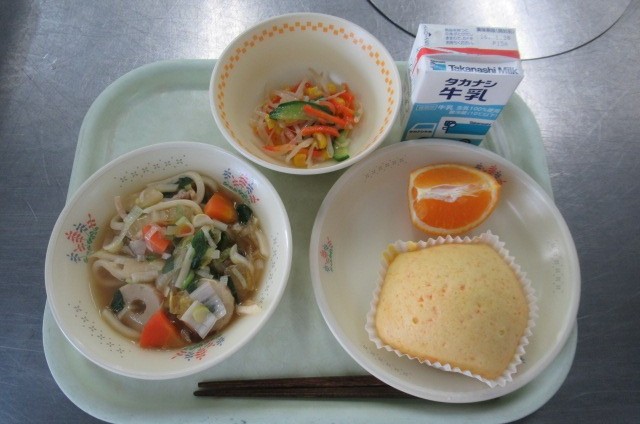 ちゃんこうどん 牛乳 みそドレッシングサラダ キャロット蒸しパン くだもの(はれひめ)