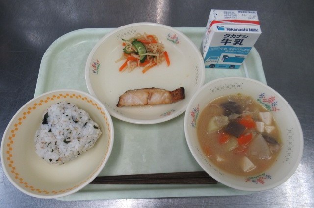 1月24日の「学校給食記念日」にちなんで、今日は最初の給食とした出された、「おにぎり、焼き魚、漬物」を再現した献立にしました。