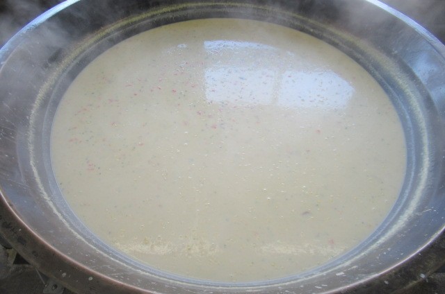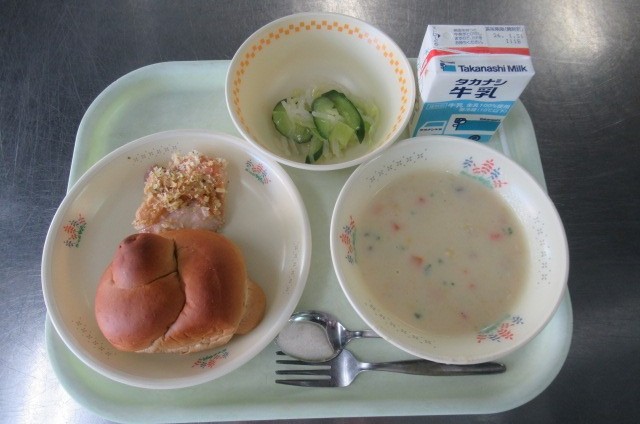 今日は、5年2組の給食委員が考えた「コーンポタージュ」です。コーンには、炭水化物、ビタミン、ミネラル、食物繊維が多く含まれています。また、牛乳には、たんぱく質やカルシウムが多く含まれているので、いろいろな栄養を丸ごと摂ることができるような献立になっています。今日のように寒い日にぴったりの「コーンポタージュ」を味わって食べましょう。