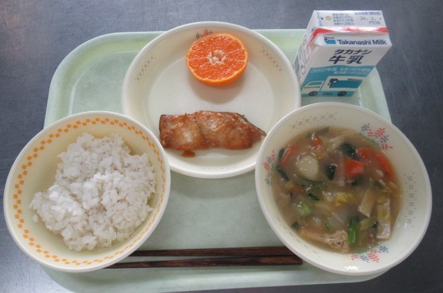 ごはん 牛乳 坊主銀宝のにんにくみそ焼き すいとん くだもの(ぽんかん)