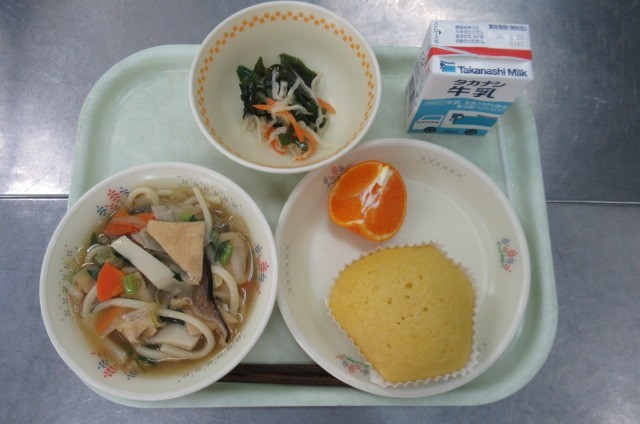 きつねうどん 牛乳 切干大根のサラダ パンプキン蒸しパン くだもの(甘平)
