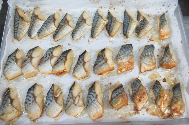 今日の魚は「さば」です。さばには、脳の働きをよくしてくれたり、血液をサラサラにしてくれたりする脂が多く含まれています。今日はさばを焼いた後、油、レモン汁、しょうゆ、からし、こしょう、砂糖で作ったタレをかけました。ごはんがすすむおかずです。