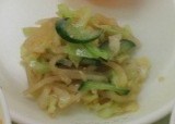 「やみつき野菜」は、5年3組の給食委員が考えた献立です。今日は、ゆでたキャベツ、大根、きゅうりに、ごま油、にんにく