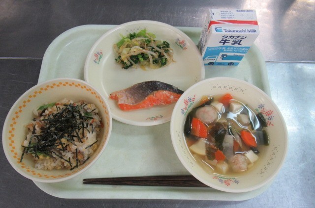 あなごちらしずし 牛乳 鮭の塩麹焼き 菜の花のごまあえ すまし汁