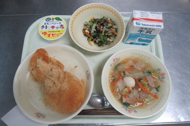 きな粉揚げパン 牛乳 春雨スープ 枝豆入りひじのサラダ 町田のゆずゼリー