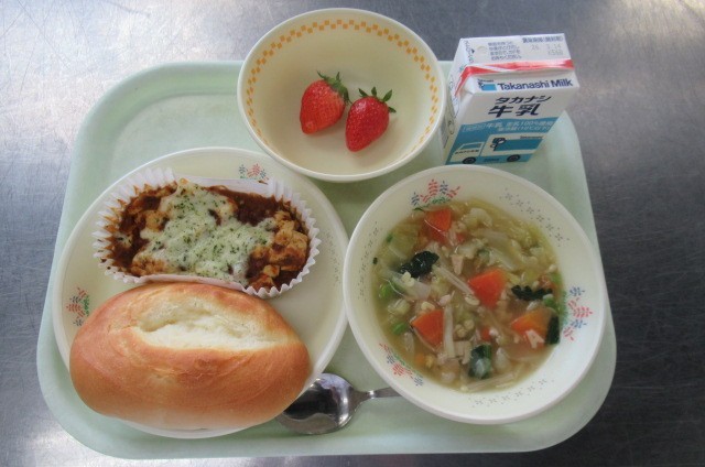 ソフトフランスパン 牛乳 豆腐のミートグラタン パスタスープ くだもの(いちご)