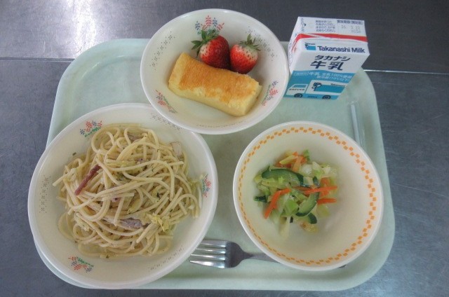 バジルスパゲッティ 牛乳 ハニーマスタードサラダ チーズケーキ くだもの(いちご)