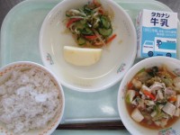 牛乳麦ごはん春雨ともやしのサラダキムチ豆腐りんご