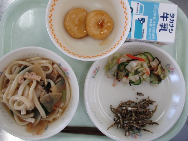 牛乳しっぽくうどんいりこのごまがらめキャベツの塩昆布あえお月見団子