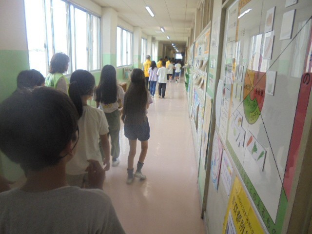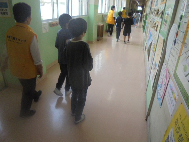 2人1組になりながら、アイマスクをしている友達に「ここは職員室前です」「今、事務室の前を通っていますよ」とあたたかい声かけをしながら体験していました。